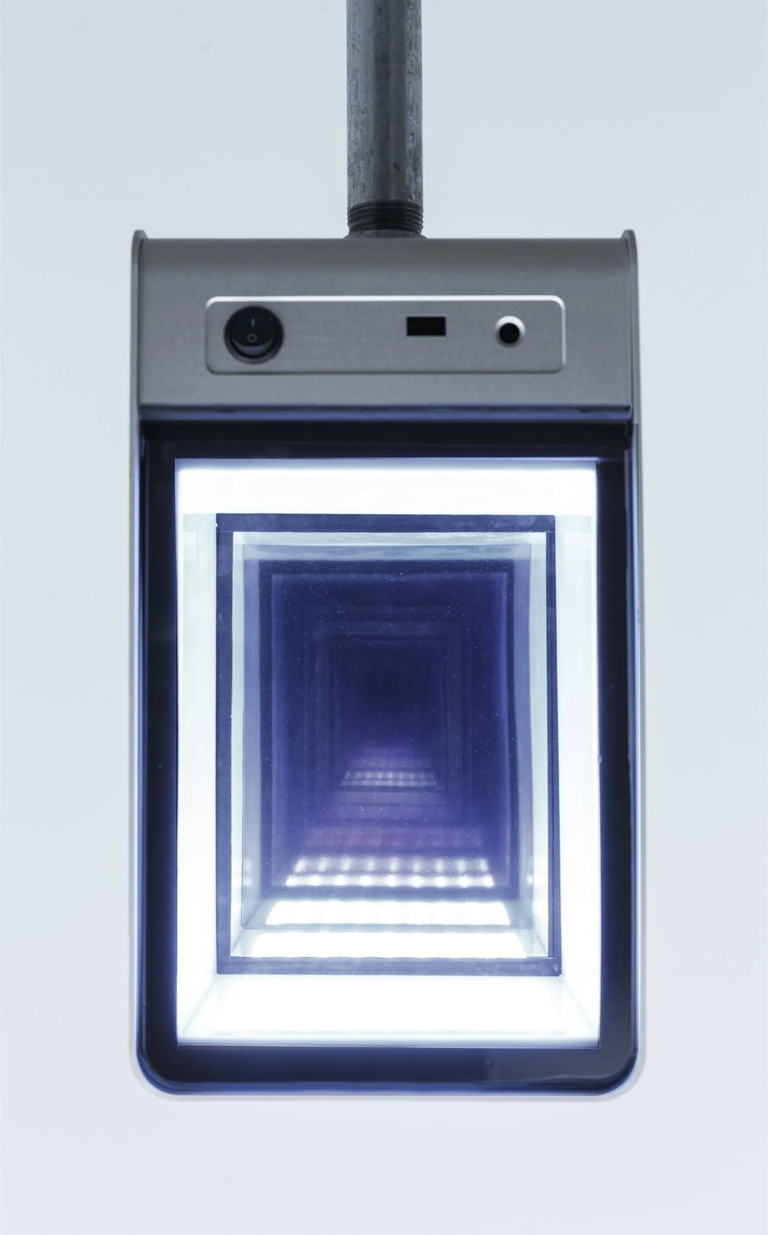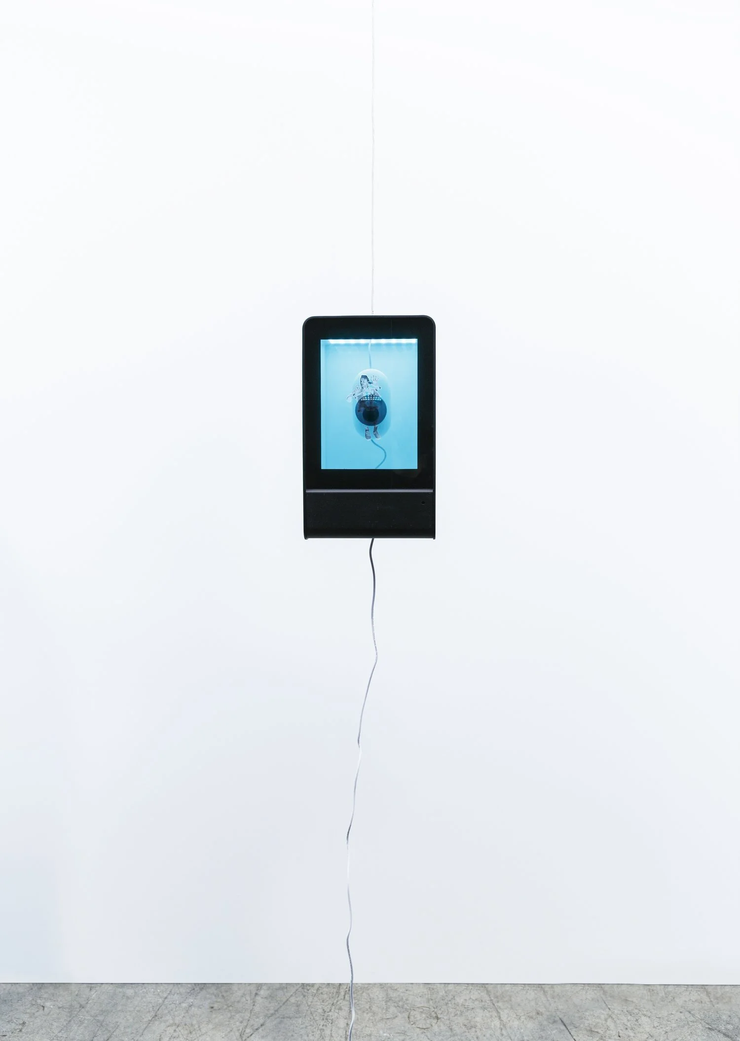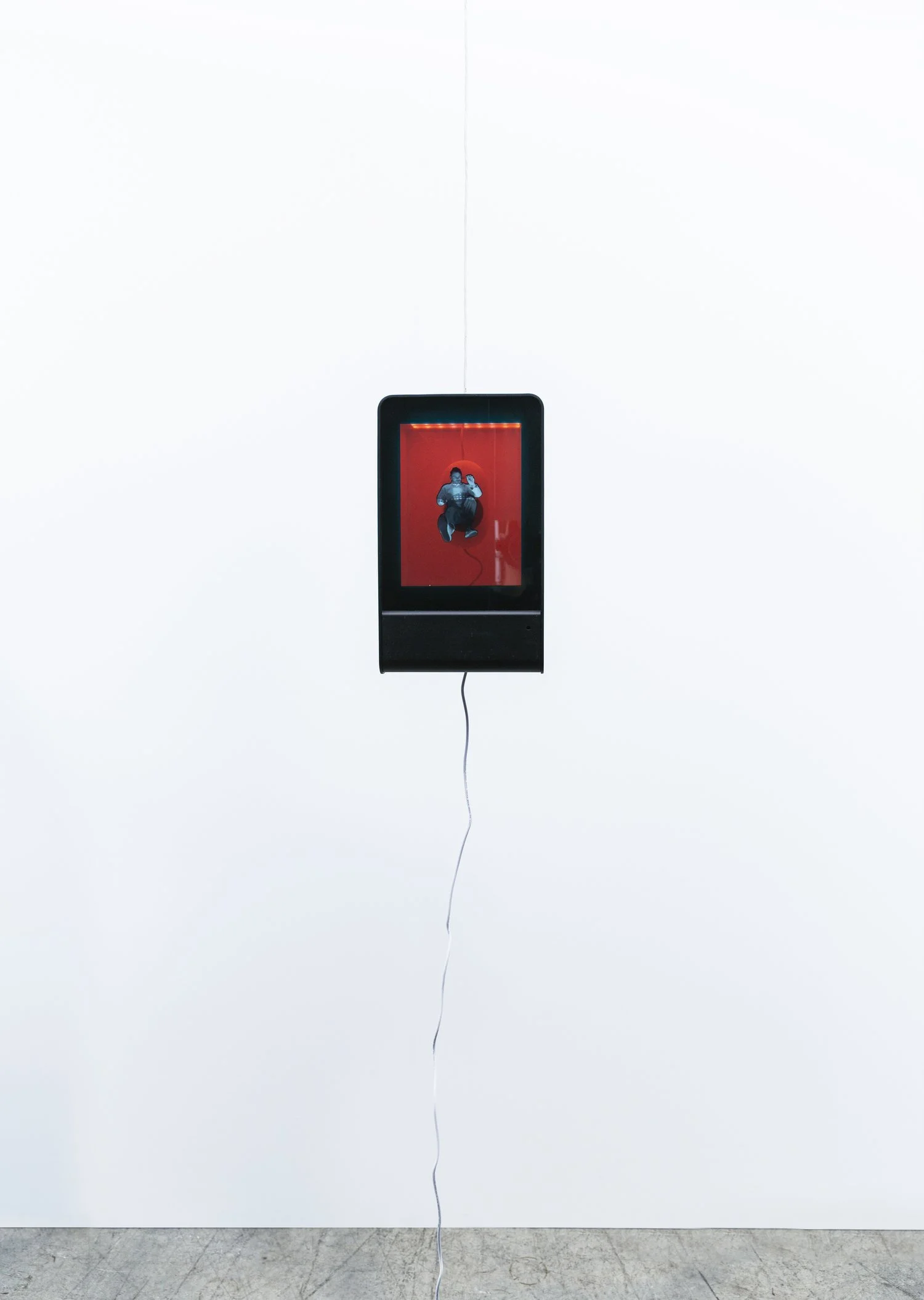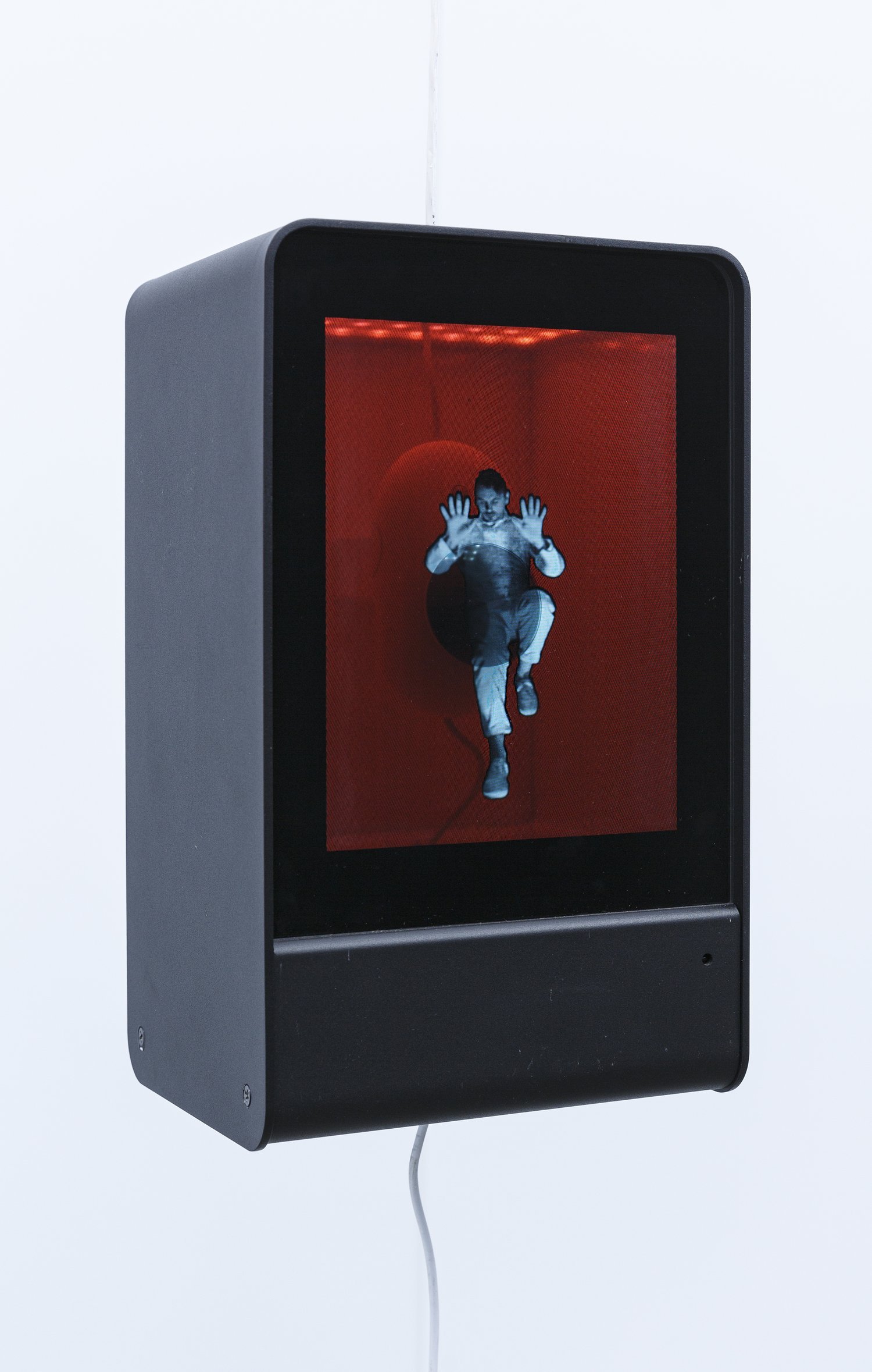 Peering into these works, we can indeed see the artist climbing, clawing, rolling and mining through the liminal space, enclosed in the commercial fixture, broadcast on the LED screen. The artist is an industrial product of his own making. The video feeds entrapped within the sculptures loop, in a repeated attempt to disrupt the machine, all while being entirely contained within it. Exits are sought, but ultimately do not lead out of the system.